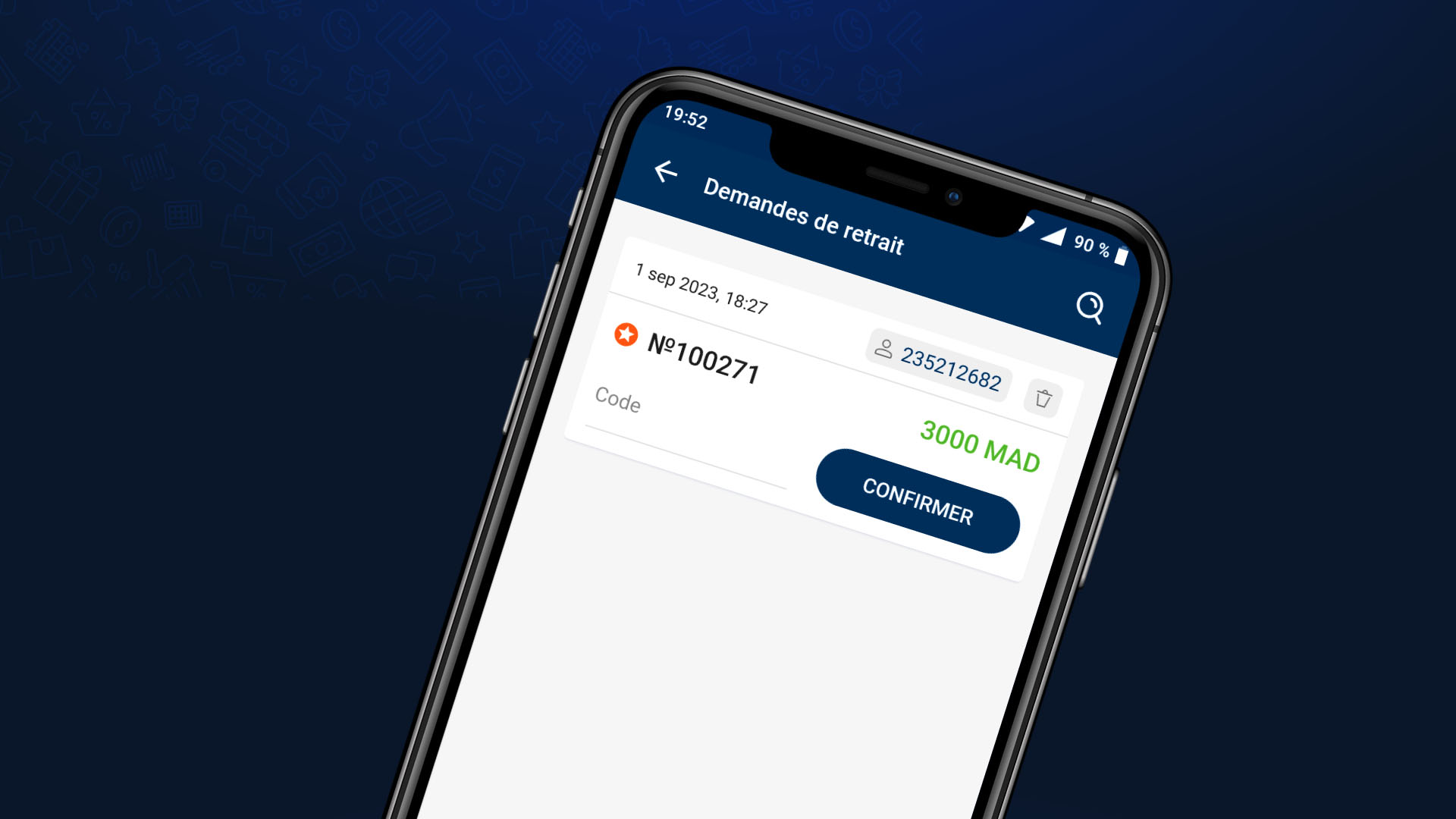- Allez dans la section Demandes de retrait, sélectionnez la demande correspondant à l'identifiant du joueur et saisissez le code de retrait reçu du joueur. Appuyez sur Confirmer et transférez les fonds au joueur.
